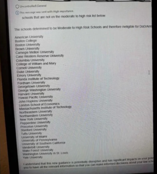 The website Above The Law obtained a copy of the memo the DoD sent out listing the private law schools that are now on the blacklist. A list of public law schools is expected to follow. The screencap is a bit hard to read, but here are the private ones: