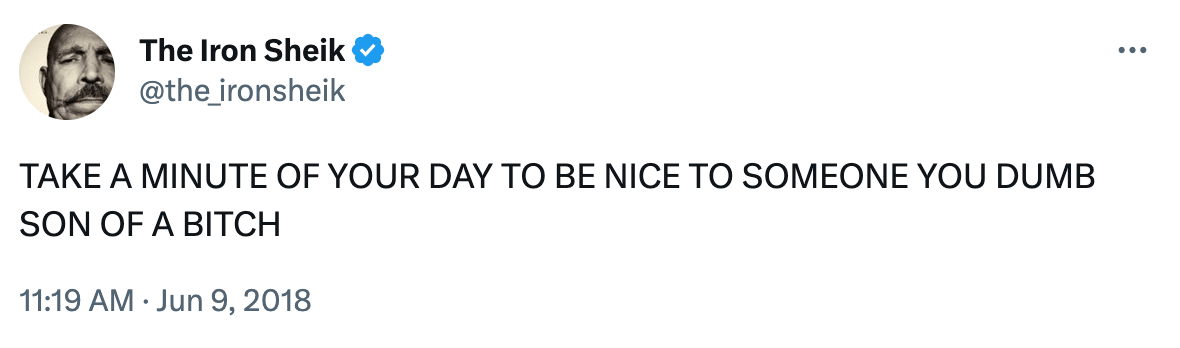 After that, unfortunately came a long period of decline for the Sheik, in which drug problems and legal problems plagued him. In 2003 his eldest daughter, Marissa, was murdered by her boyfriend. He would leave the WWF and return multiple times while wrestling with other promotions, managing, acting, and engaging in other wrestling-related business ventures. Starting in the late 2000s he became known for his Twitter account, which featured often hilarious profanity-laden Tweets denouncing various celebrities and other wrestlers. Or just giving advice: